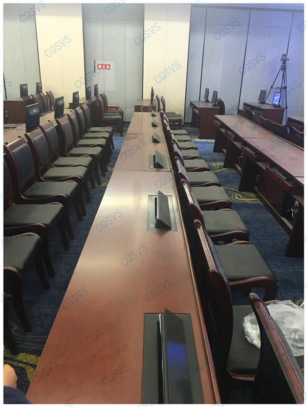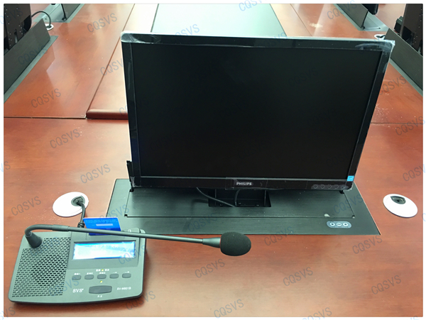 液晶升降器,當不需要顯示設備的時候可隱藏于會議桌上,節省了空間的同時也更加美觀: