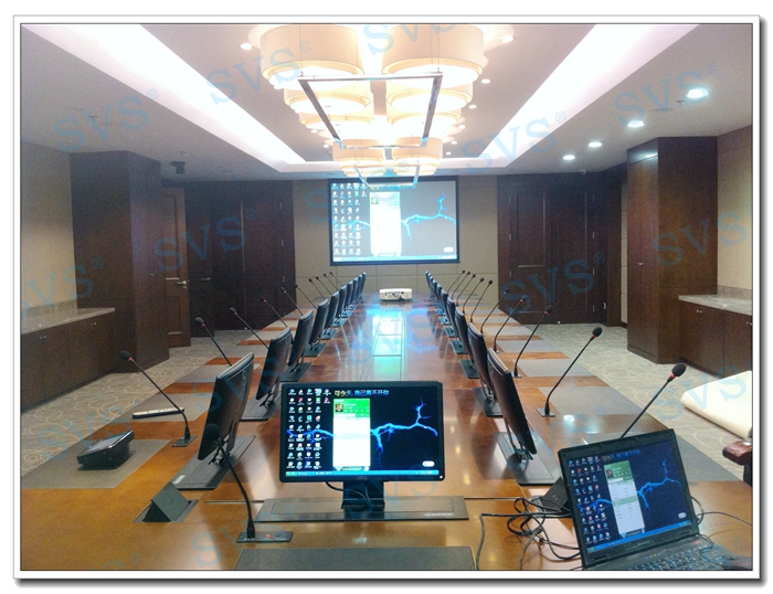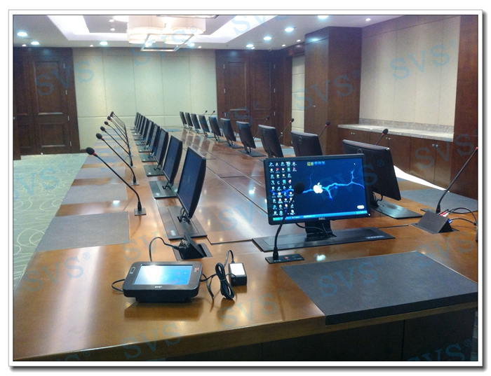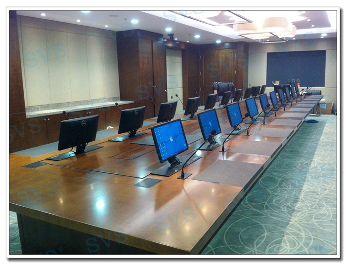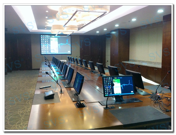 實現功能:會場21個桌面顯示器升降系統,同步及異步升降控制,顯示信號同步及異步顯示會場21個發言位高品質數字發言支持會場靈活無線發言會場實現會議發言實時跟蹤實現多點遠程視頻會議功能實現投影機智能開關機、自動電源保護、多路信號顯示管理會場信息盒系統實現現場多路外接信號靈活切入系統實現會場設備電源管理根據客戶需要定制觸摸屏控制界面,實現會場的聲、光、電智能控制