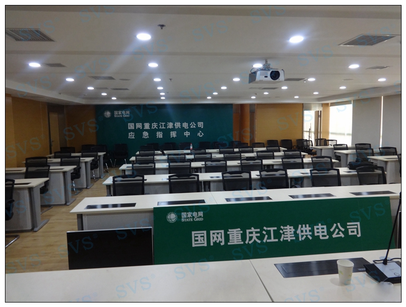 此次迅控為重慶市江津供電公司打造應急指揮中心,中心可同時容納70人進行會議,每個席位都配有獨立的桌面顯示隱藏設備,可在需要時同步或異步使用顯示器,并智能的控制顯示信號,配合現場的雙投影顯示,構成指揮中心多媒體顯示系統;通過中央控制系統實現對整個會場的數字化控制,包括環境控制、顯示控制、設備電源控制、會場聲音控制、會議模式控制等功能;為用戶打造出一個數字化的智能應急指揮中心。