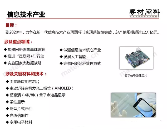 戰略性新興產業代表新一輪科技革命和產業變革的方向,是培育發展新動能、獲取未來競爭新優勢的關鍵領域。“十三五”時期,要把戰略性新興產業擺在經濟社會發展更加突出的位置,大力構建現代產業新體系,推動經濟社會持續健康發展。根據“十三五”規劃綱要有關部署,特編制本規劃,規劃期為2016—2020年。關于顯示產業相關內容,規劃提到“提升核心基礎硬件供給能力。提升關鍵芯片設計水平,發展面向新應用的芯片。加快16/14納米工藝產業化和存儲器生產線建設,提升封裝測試業技術水平和產業集中度,加緊布局后摩爾定律時代芯片相關領域。實現主動矩陣有機發光二極管(AMOLED)、超高清(4K/8K)量子點液晶顯示、柔性顯示等技術國產化突破及規模應用。推動智能傳感器、電力電子、印刷電子、半導體照明、慣性導航等領域關鍵技術研發和產業化,提升新型片式元件、光通信器件、專用電子材料供給保障能力。在材料領域,還專門成立了新材料產業發展領導小組: