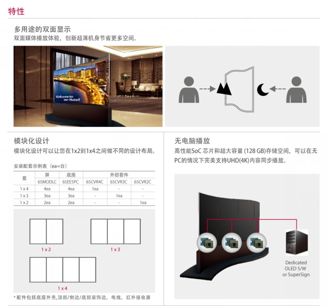 同樣擁有OLED顯示技術的LG雙曲面波浪形拼接顯示器65EE5PC,就是您所期待的高端商用顯示神器!!其雙面都可以媒體播放的體驗,打破了傳統顯示產品只能靠邊、靠墻、懸掛的方式,不用擔心背部的美觀。其模組厚度是令人驚嘆的8.54mm,創新超薄機身可以節省大量空間,根本不需要為空間擔心。