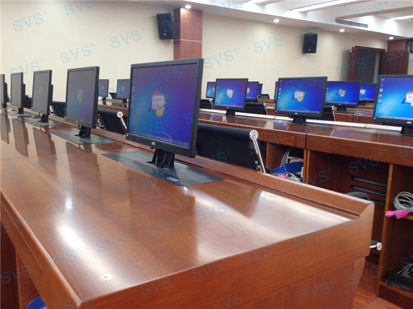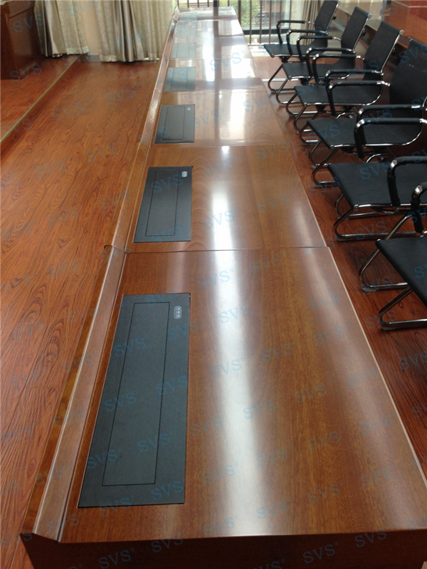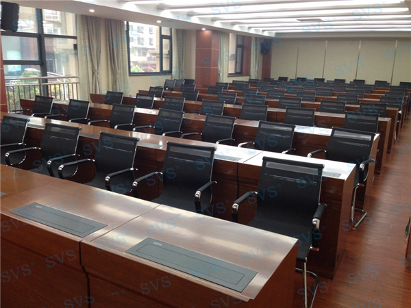 SVS迅控此次為某農商銀行打造一個大型無紙化會議系統多功能廳,會場支持數據會議模式、培訓模式、選舉模式、普通會議模式等多種使用模式,桌面隱藏式液晶屏顯示器可根據會議需要選擇升降,保證會場的整潔和方便日常的維護,無紙化會議模式讓客戶體會到一個全新的會議方式,得到領導的高度認可。