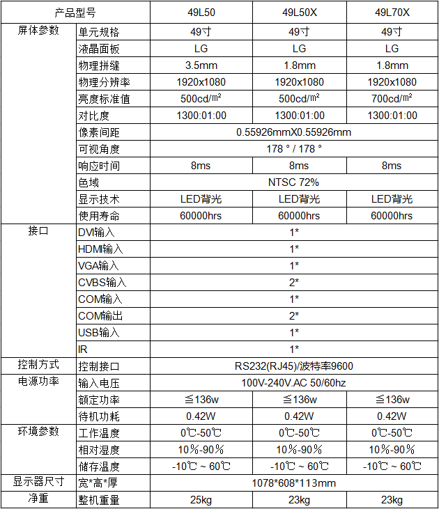 49寸液晶拼接顯示器技術參數表