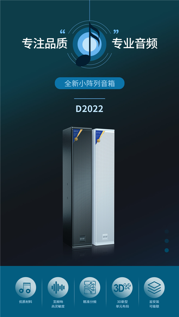 D2022是一款緊湊型大功率的線性陣列音箱,采用4個4.5英寸的全頻單元和2個3英寸高音單元、內置高精度分頻器和高端樺木板材組成;該音箱單元采用3D新型安裝方式,非傳統的簡單平面布置措施,保證了不同的單元聲音輸出聲波不疊加能量,讓發出的聲音更加清晰,有效聲場范圍更廣,也避免了聲波能量抵消,自然達到高保真音質和高還原度的效果。因為體積小、功率大,可級聯疊加和易安裝等特點,被廣泛應用于高端會議室、影院、報告廳和禮堂等場合。