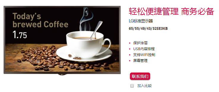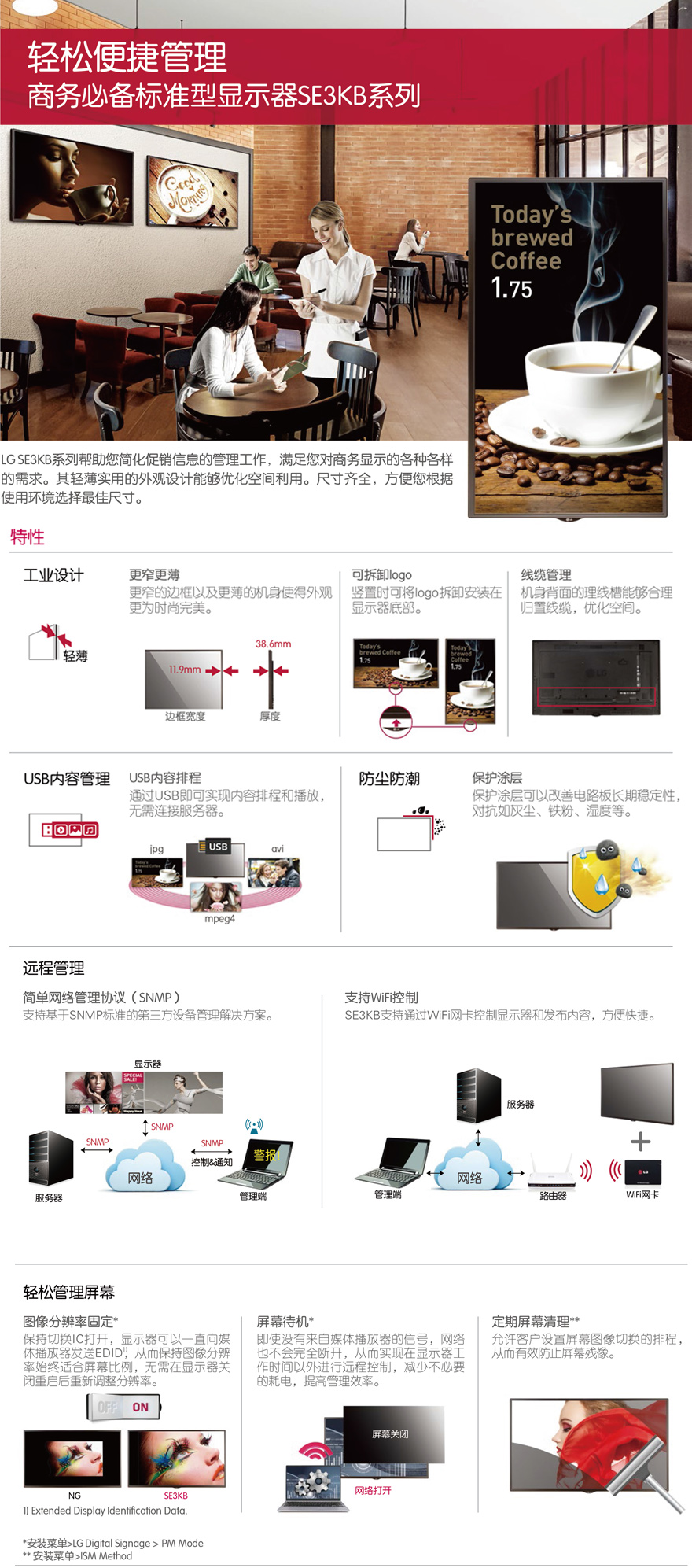 - USB內容排程, 保護涂層,SNMP支持, 支持Wi-Fi(Dongle),電源管理模式,假日排程/當地時間自動設定,Wake on LAN,無信號畫面設置, ISM殘像防止,Fall-over(USB,RGB,DVI,HDMI)