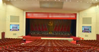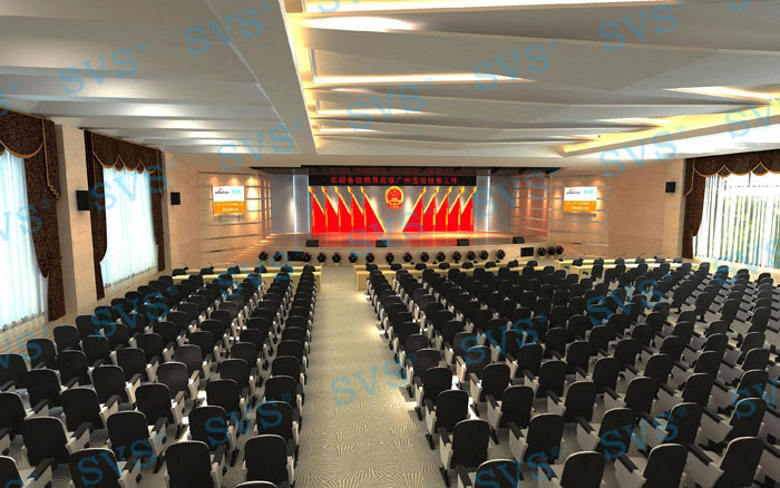 系統闡述: 顯示部分: 使用RS系列150寸光學背投硬幕,具有高光透度、高對比度、高色彩還原等,適合多角度無損觀看,獨有的鋁合金鑲嵌式結構、耐磨、美觀、不易變形等特點。背投反射率可達90%以上,無太陽效應。 擴聲部分: 因會場面積偏大,配置使用4只12寸同軸音箱作為主擴聲,配合8只雙5寸同軸音箱作為輔助擴聲,同軸音箱的高低頻同步性,讓聽者更加輕松、真實,高靈敏度及穿透性讓聲音表現更加細膩、完美。由于會場縱深過大,配合其功能要求所配置了4只12寸返聽音箱,2只雙18寸專業低音音箱,在降低聲音傳播延時